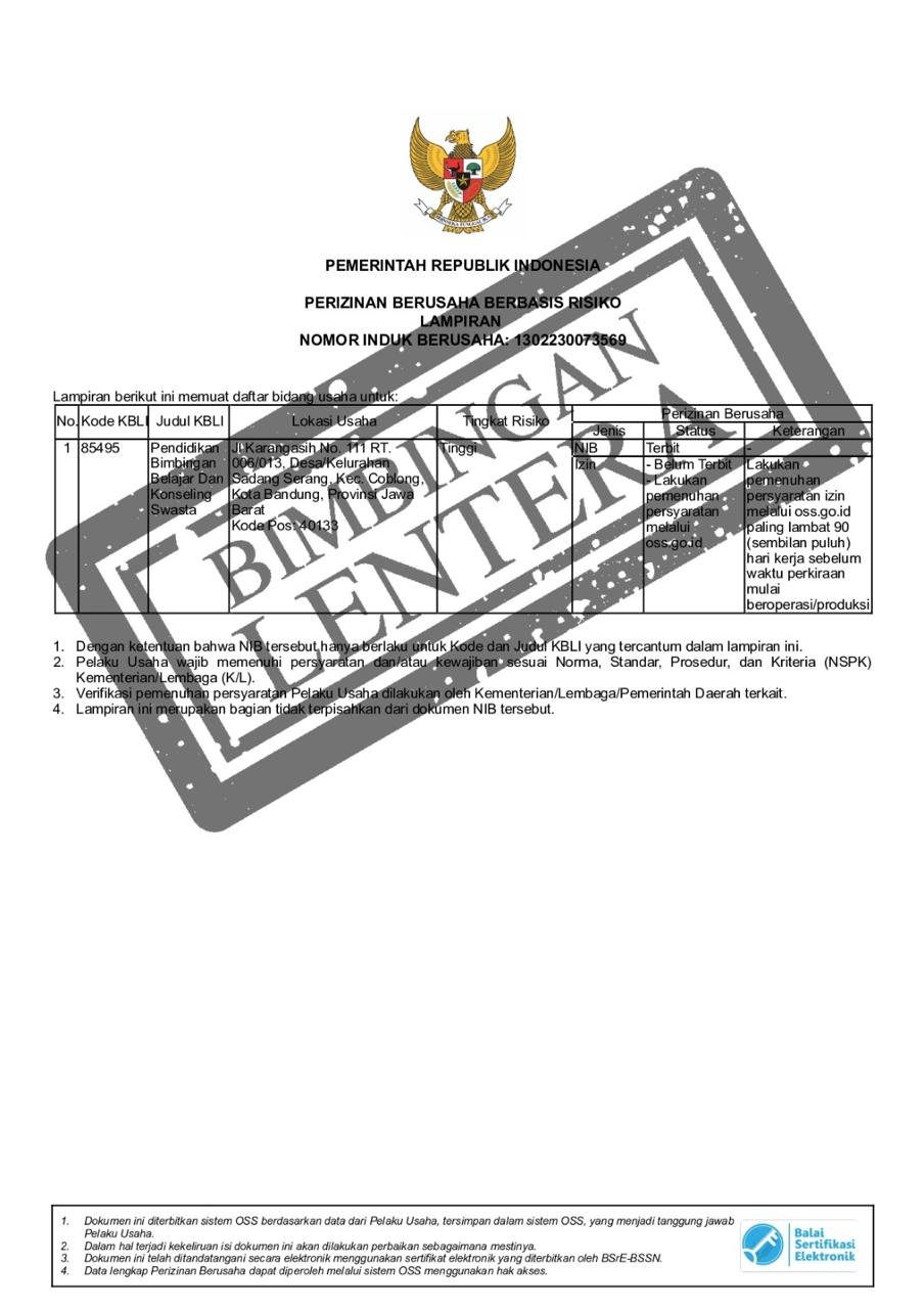 Lentera Bimbingan beroperasi secara resmi dan legal, didukung oleh dokumen perizinan usaha yang sah sesuai dengan ketentuan hukum yang berlaku di Indonesia. Seluruh aktivitas layanan bimbingan akademik kami dijalankan dengan prinsip transparansi, profesionalisme, dan akuntabilitas.