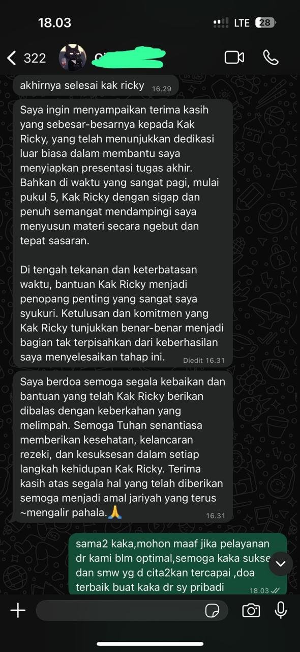 Lentera Skripsi menyediakan jasa bimbingan skripsi, tesis, dan disertasi dengan pendekatan edukatif, bukan joki, sehingga mahasiswa memahami materi dan siap mempertanggungjawabkan karyanya.